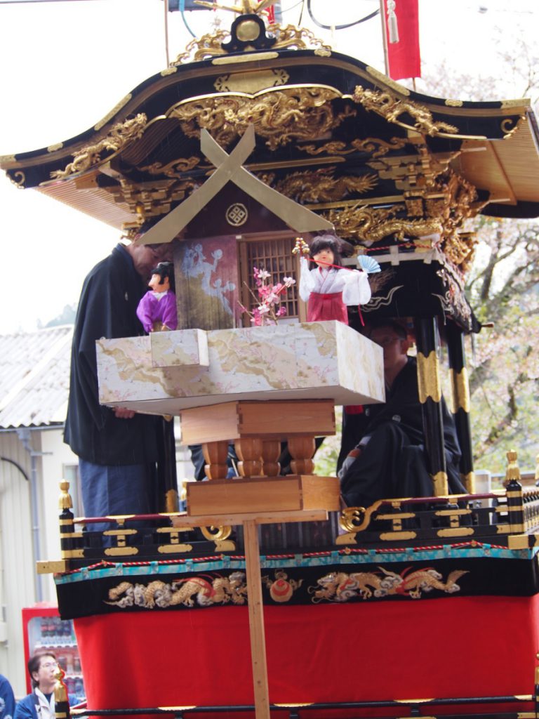 山車の上に設けられた舞台の上では、独創的な繰り人形劇がくり広げられます。その人形劇の動きの秘密は「糸切りからくり」という独特な技法と操作にあり、歴史的、芸術的な価値も評価されています。