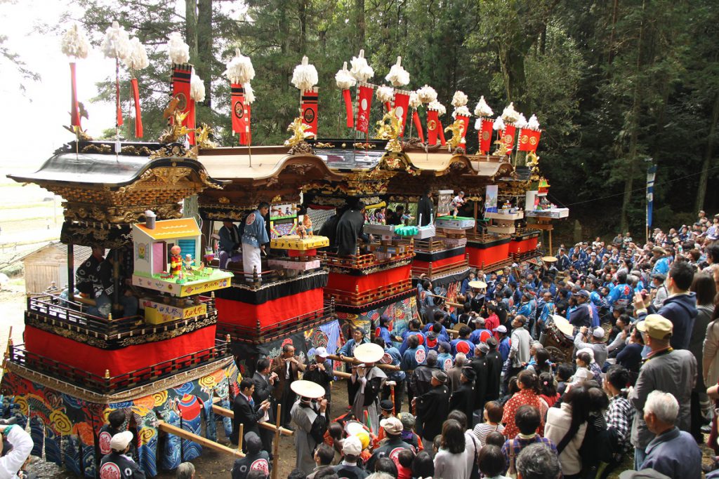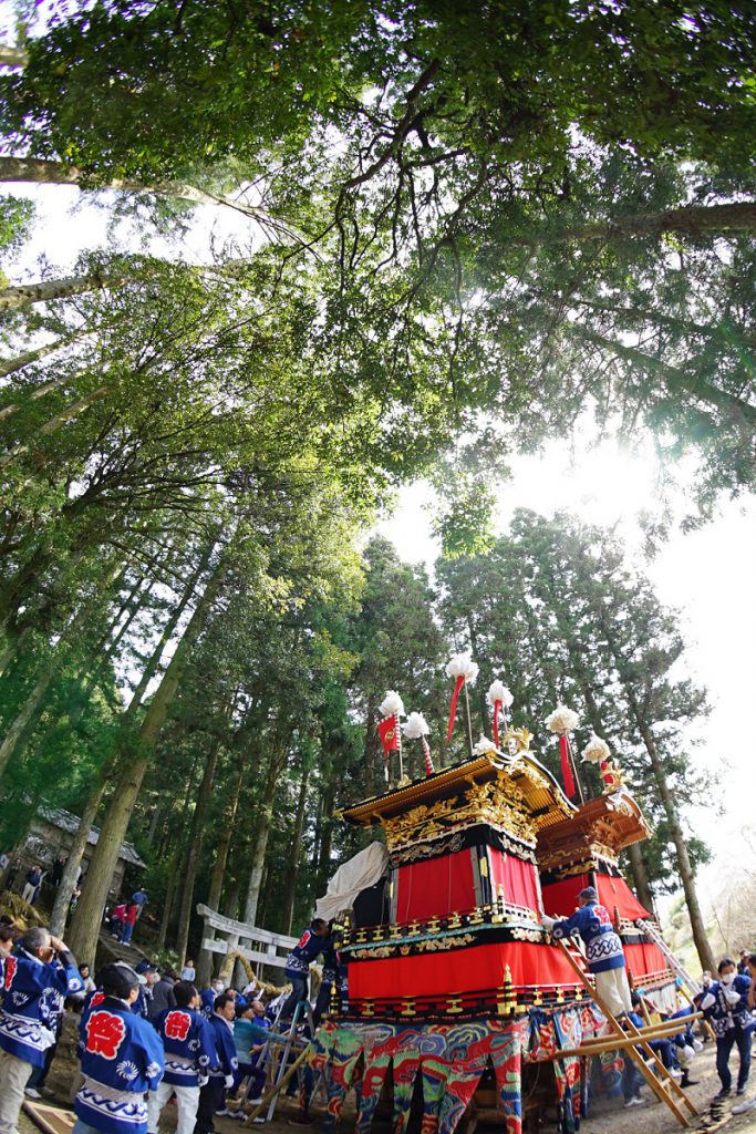 6両の山車がそろい、大行列を組んで進む姿は、平安絵巻のような華麗さ。神明・白鬚両神社で行われるからくりの奉納は、現代の世相を伝統の技で表現します。