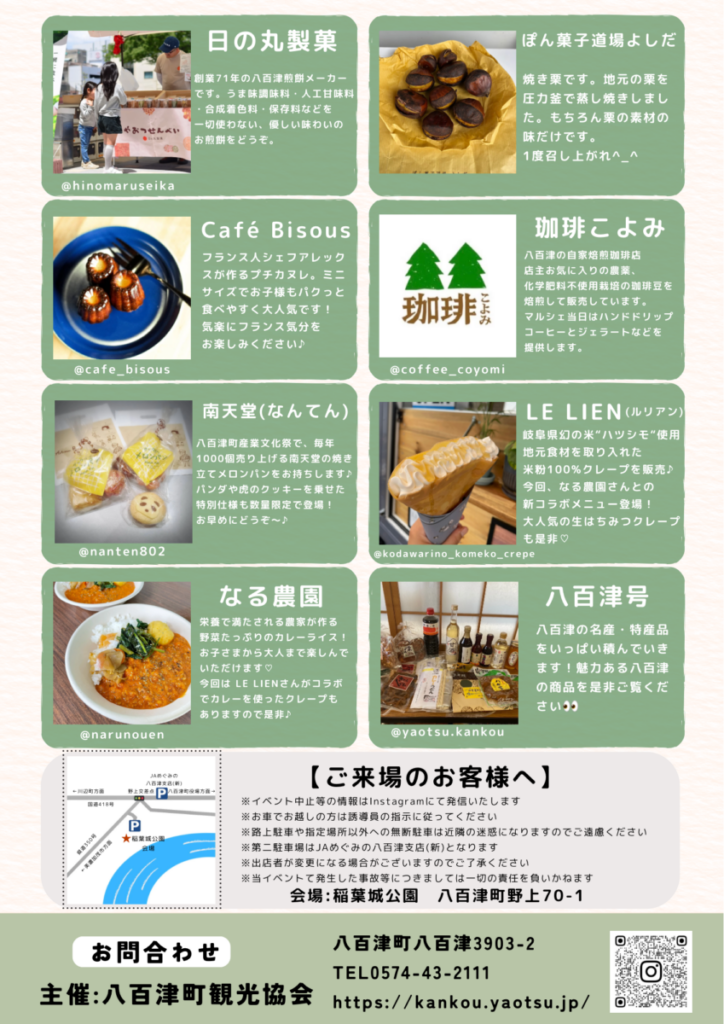 令和7年10月26日(日)10時00分~15時00分に、八百津町にある稲葉城公園にて、やおつまるしぇを実施。当日は、観光協会員による、八百津町の魅力ある商品を販売するほか、ドキドキわくわくの謎解きラリー、お菓子投げなど行います!皆様お誘いあわせのうえ、ぜひお越しください!!